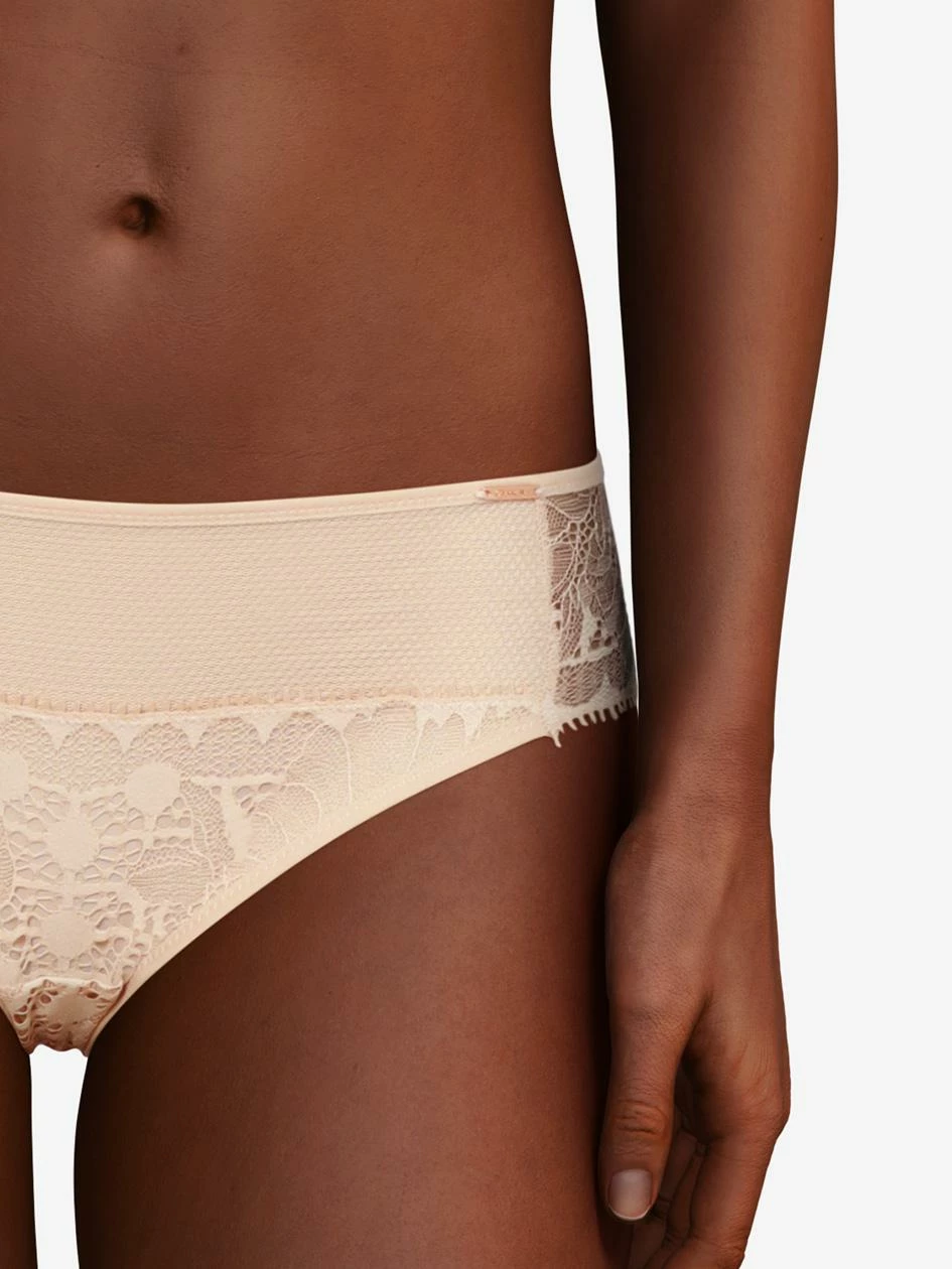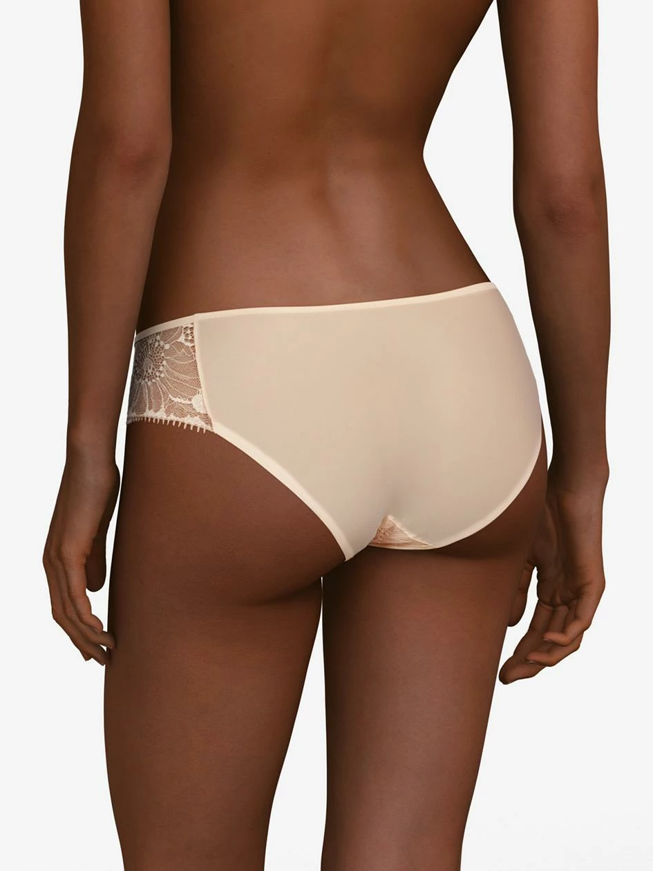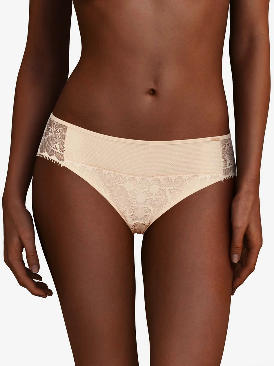 Der Slip von Chantelle verbindet Spitze vorne und blickdichte Materialien hinten.
