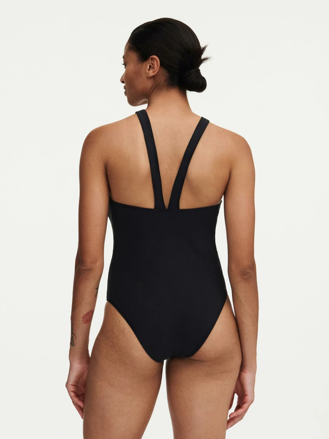 Badeanzug ohne Bügel von Chantelle der einen geraden, nahtlosen Ausschnitt hat und in der Mitte ein goldenes Schmuckstück besitzt.